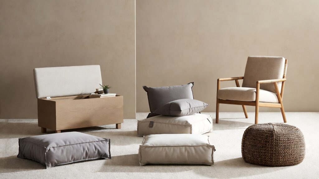 Floor cushions (waterproof, please), a single accent chair, a storage bench, or an outdoor pouf all do the trick. Neutrals are big right now if you want to keep things trendy.