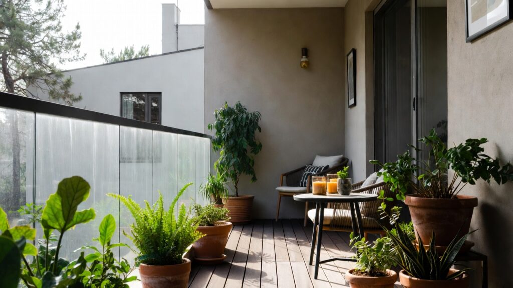 Stick to easy stuff: snake plant, spider plant, pothos, lavender, and herbs like basil, rosemary, or mint. If your balcony doesn’t get much sun, don’t stress—artificial plants can still look awesome.