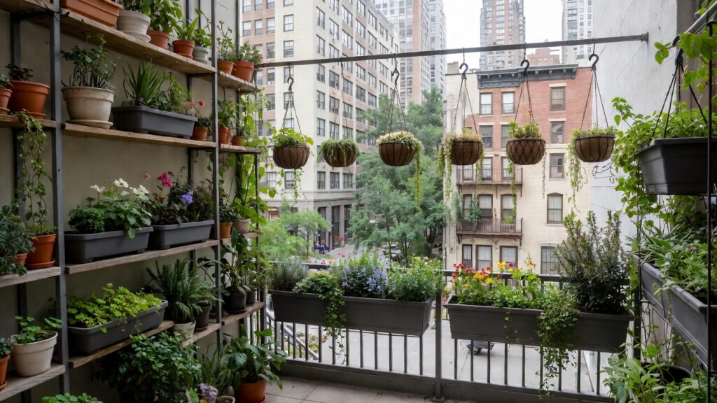 Try wall-mounted shelves, hanging planters, railing planter boxes, or even a vertical garden frame. This trick is super popular in American cities where every square inch counts.
